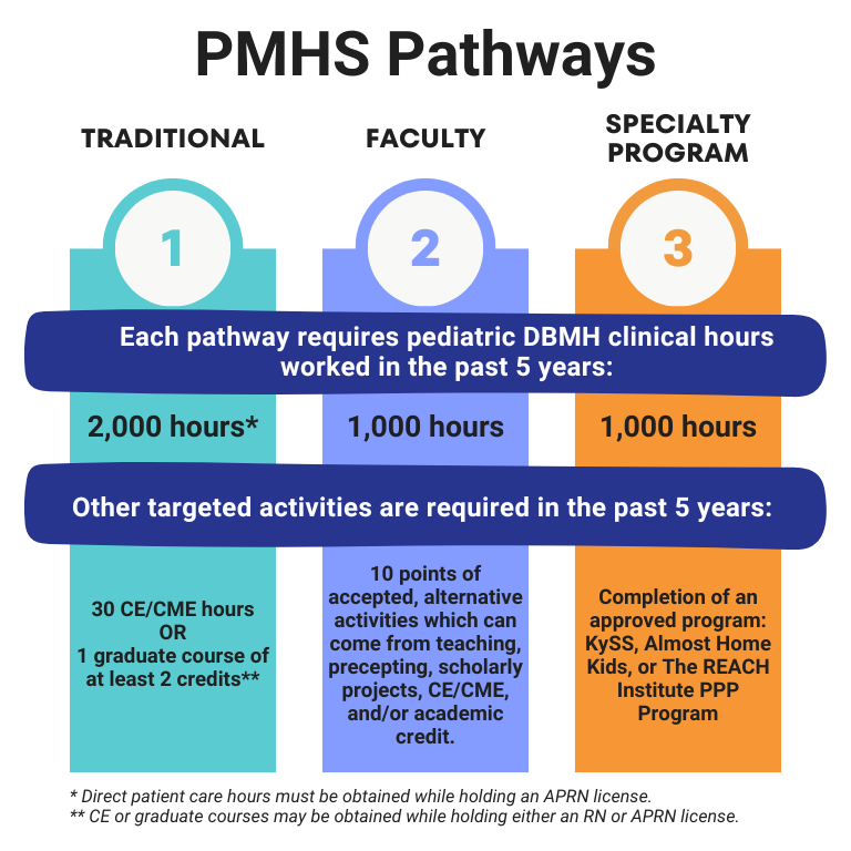 Traditional Pathway – Document 30 hours of CE/CME or 1 graduate course of at least 2 credits related to pediatric developmental, behavioral, and mental health in the past 5 years and a minimum of 2,000 hours of pediatric, developmental, behavioral, and mental health (DBMH) clinical practice (with or without a preceptor) while holding an APRN license in the past 5 years.